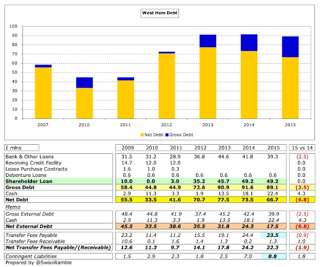 It is clear that West Ham are building up their debt in order to give themselves the best chance of success, both in terms of financial debt and transfer debt, though this is probably OK, so long as they avoid relegation.